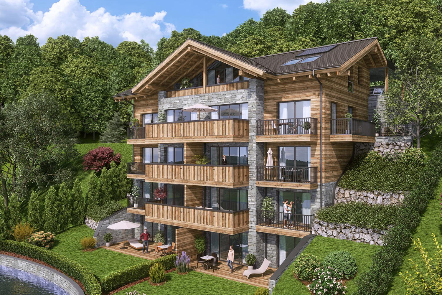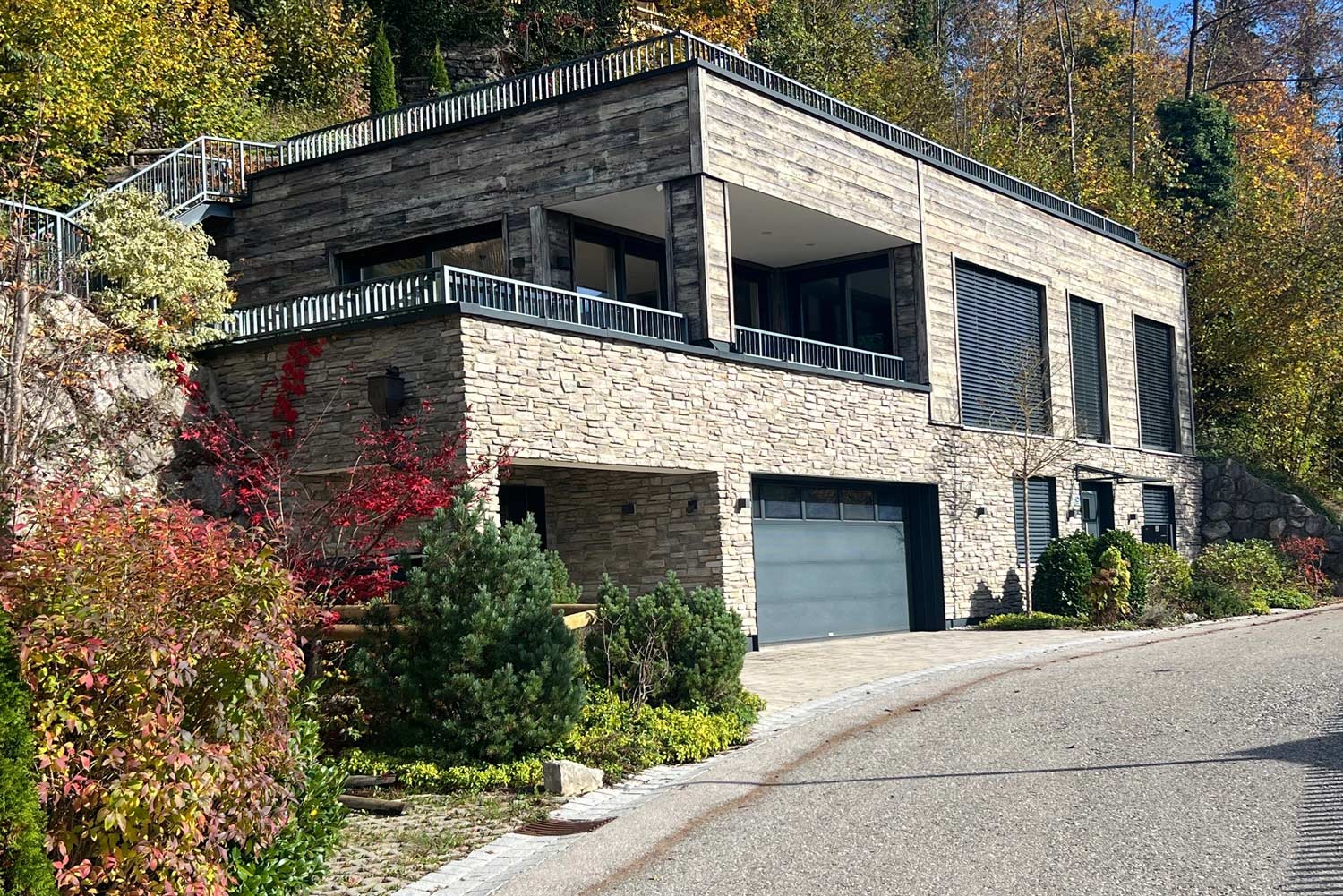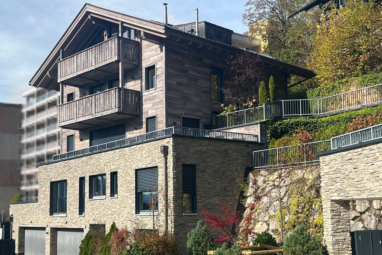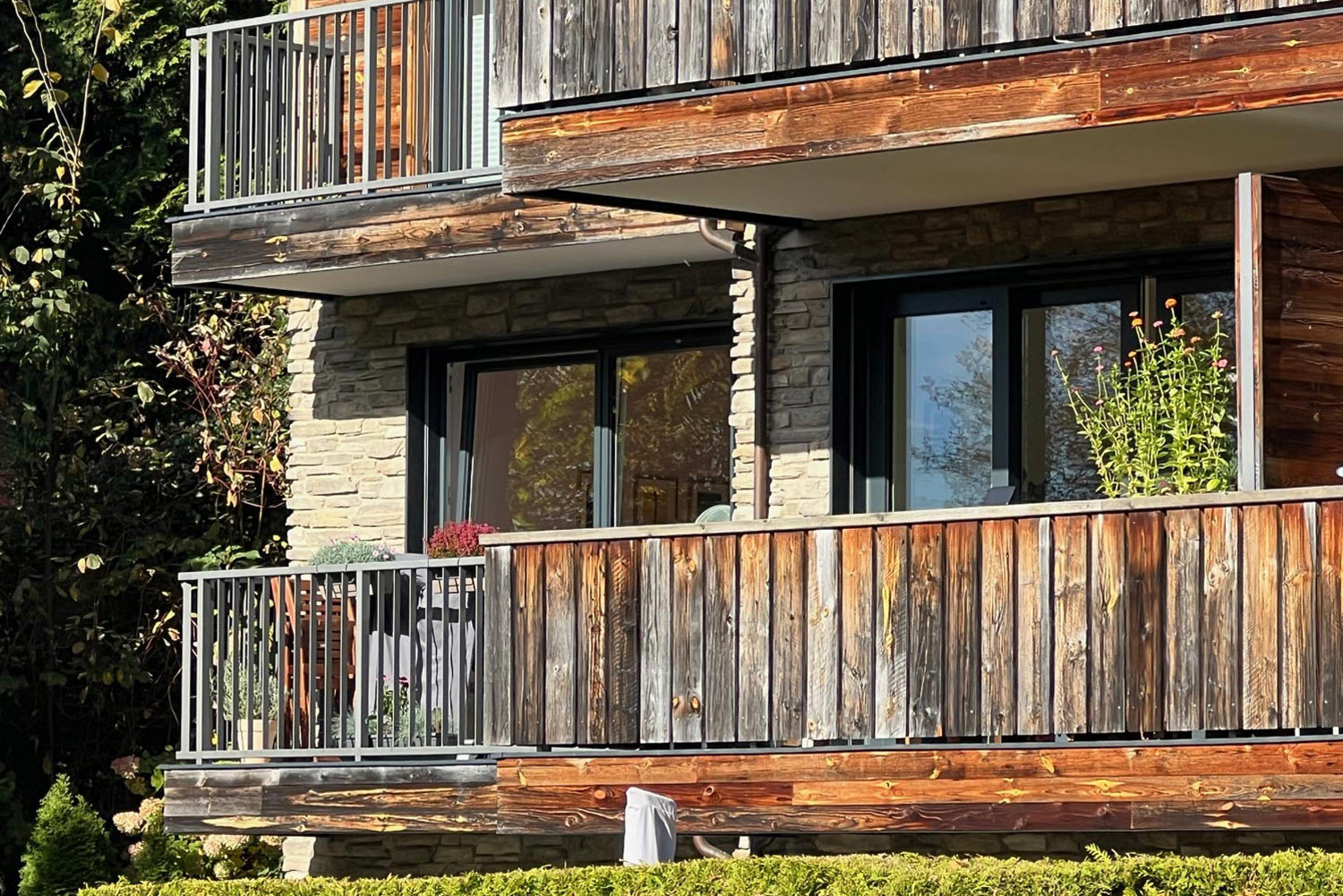 Attraktive Wohnanlage. Ensemble aus 2 Gebäude in Hanglage. Gestalterische Elemente: Altholzoptik und Natursteinfassade.