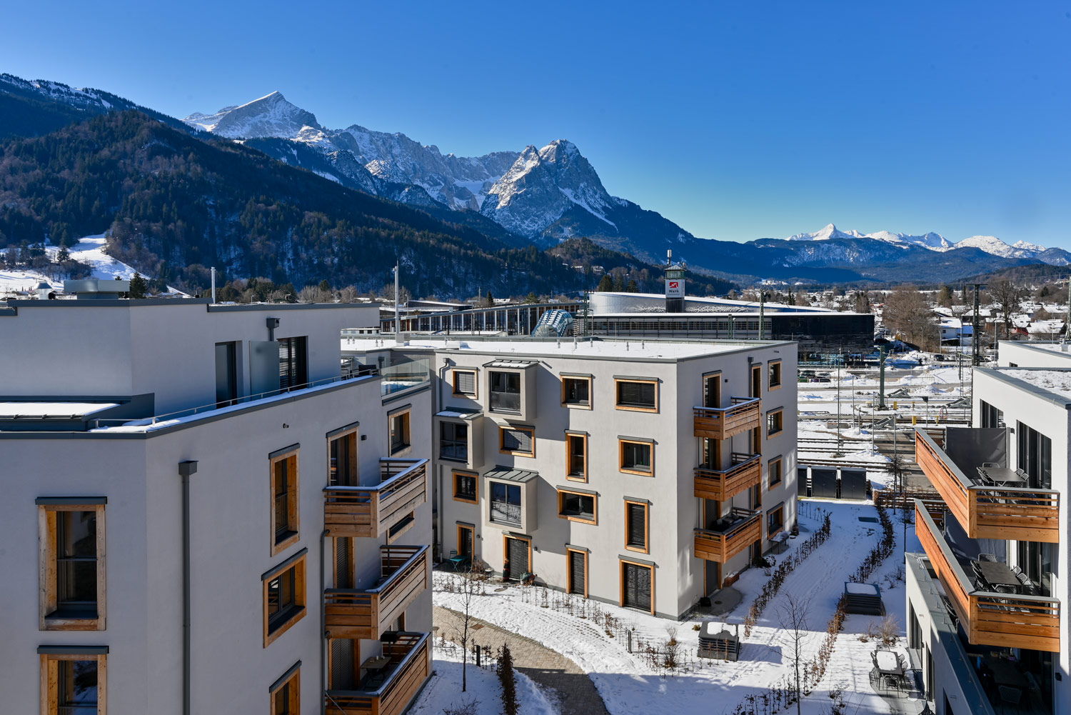 Moderne Wohnanlage im Zentrum des Ortsteils Garmisch. Mehrere Eigentumswohnungen, Ferienwohnungen, Mitarbeiterwohnen (Klinikum GAP), Hostel (DJH), Team Ressort, Gastronomie und Büro’s.